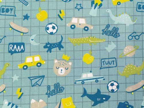 Tela infantil verde con juguetes